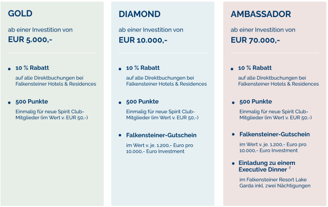 Ab mindestens 70.000 Euro, ein Betrag, der in Deutschland nur von Unternehmen investiert werden kann, erhält man den Ambassador-Status und eine Einladung, zu einem Executive Dinner im 5-Sterne Falkensteiner Resort Lake Garda inklusive zwei Übernachtungen. Außerdem sind 10 Prozent Rabatt auf Direktbuchungen, 500 Punkte für neue Diamond Spirit Club-Mitglieder und ein Falkensteiner-Einmal-Gutschein von mindestens 8.400 Euro inklusive.