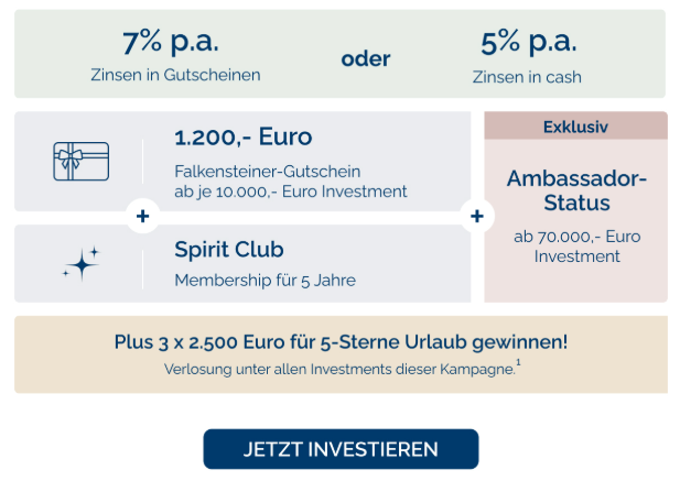| Kampagne 15: Anlegen. Ankommen. | 5,00 Prozent Zinsen p.a. in Cash oder 7,00 Prozent Zinsen p.a. in Falkensteiner-Gutscheinen |