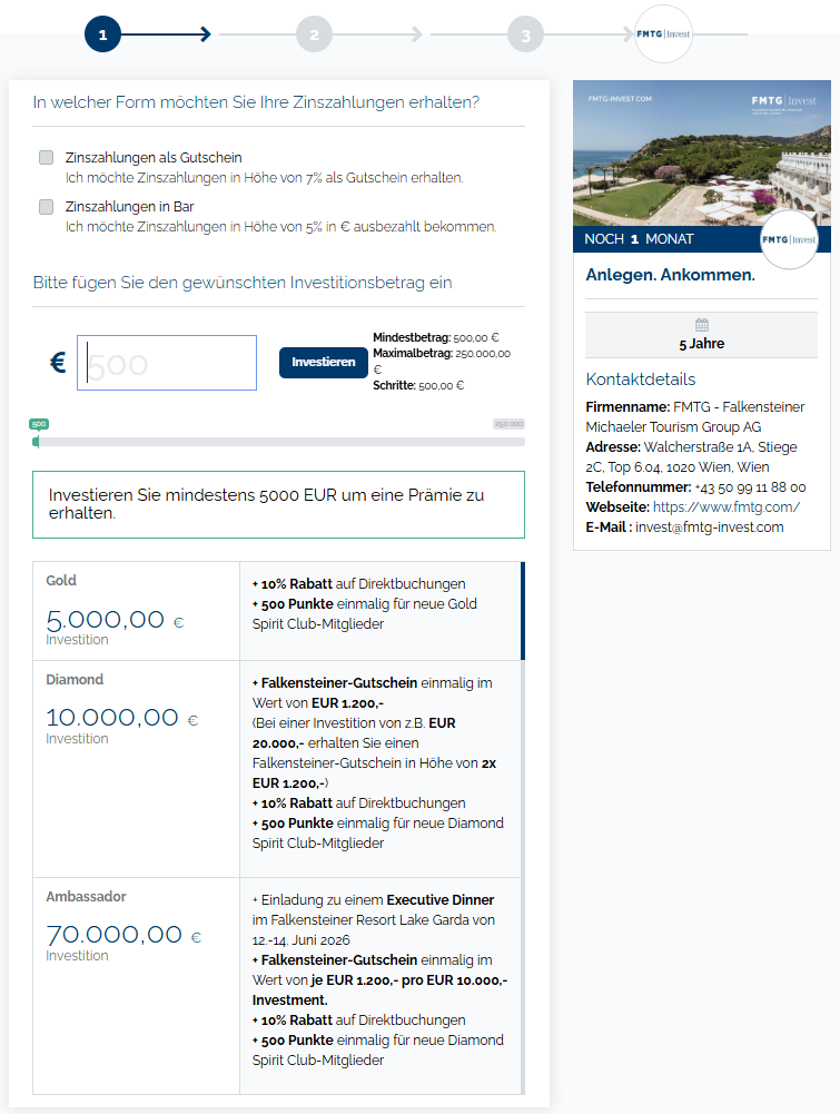 Bei FMTG Invest erhalten Investoren in verschiedenen Staffelungen Prämien, zusätzlich zu den ausgezahlten Zinsen und den Falkensteiner-Gutscheinen. Je nachdem, wie viel ein Anleger einzahlt, erhalten Anleger unterschiedliche Vorteile.