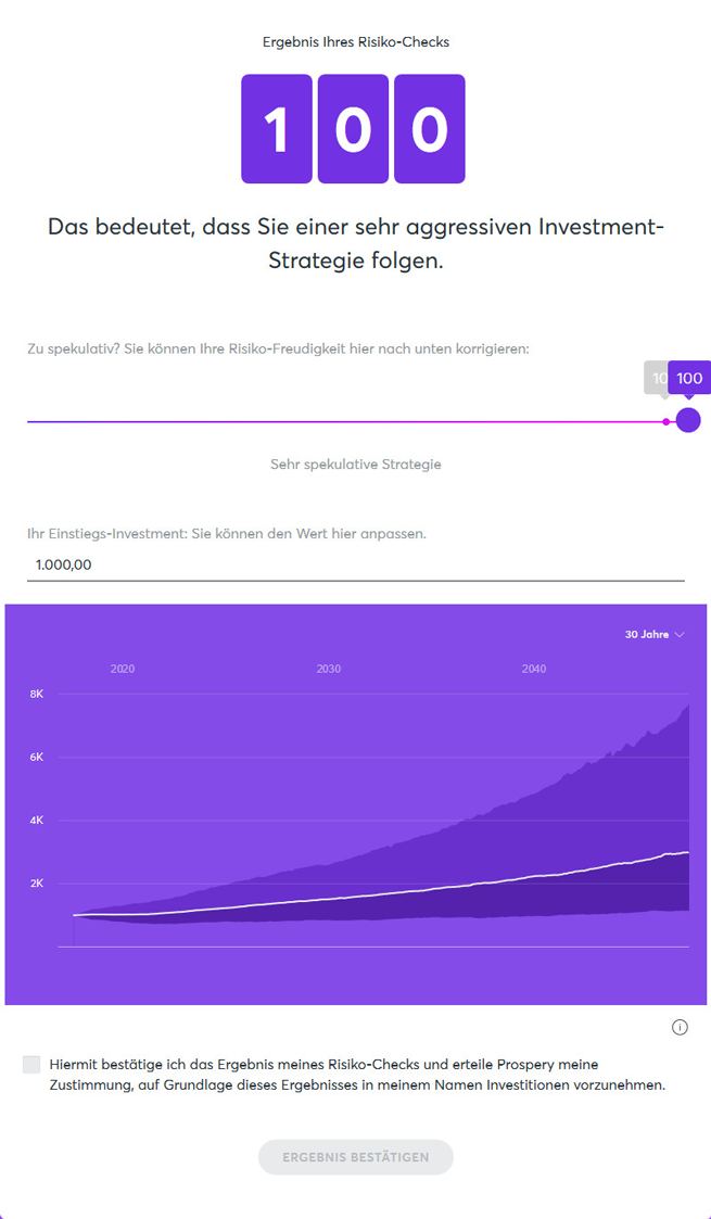 Besonders einfach macht Prospery es Anlegern nicht, Prospery Invest zu eröffnen. Durch die Vielzahl von Produkten kann zunächst Verwirrung entstehen. Risiko-Check und Anlagestrecke sind zudem langwierig – was allerdings auch den Vorgaben durch MiFid II geschuldet ist. Wer Schwierigkeiten bei der Eröffnung hat, kann sich zudem kostenfrei an den Kundenservice wenden. Immer zu Beginn der einzelnen Segmente wird der Anlageprozess zudem gespeichert und kann zu einem späteren Zeitpunkt fortgesetzt werden.
