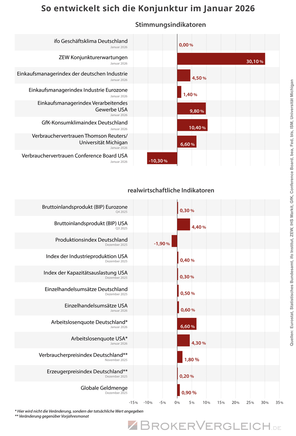 Die Stimmungsindikatoren entwickeln sich zum Jahresstart überwiegend positiv. Besonders deutlich fällt der Anstieg bei den ZEW-Konjunkturerwartungen mit +30,1 Prozent aus, ein Signal steigender Zuversicht der Finanzexperten. Auch das GfK-Konsumklima in Deutschland verbessert sich spürbar um +10,4 Prozent. Die Einkaufsmanagerindizes legen ebenfalls zu: Die deutsche Industrie steigt um +4,5 Prozent, die Eurozone um +1,4 Prozent und das verarbeitende Gewerbe in den USA sogar um +9,8 Prozent. Das Verbrauchervertrauen der Universität Michigan gewinnt +6,6 Prozent hinzu. Einziger klarer Dämpfer ist der Conference-Board-Index in den USA, der um –10,3 Prozent nachgibt. Das ifo-Geschäftsklima bleibt mit 0,0 Prozent unverändert zum Vormonat. Insgesamt überwiegt damit eine spürbare Stimmungsaufhellung.